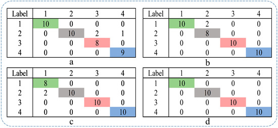 MPFE, CMPFE, MvMPFE (rms), and CMvMPFE (rms) confusion matrix: (a) MPFE; (b) CMPFE; (c) MvMPFE (rms); (d) CMvMPFE (rms). (Green indicates the number of normal classified as normal, gray indicates the number of rolling element faults classified as rolling element faults, red indicates the number of inner ring faults classified as inner ring faults, and blue indicates the number of outer ring faults classified as outer ring faults).
