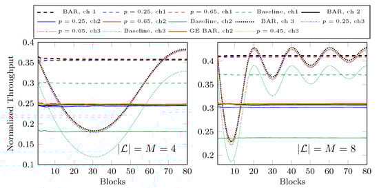We also consider the expected rank functions for burst packet loss channels modelled by Gilbert–Elliott (GE) models [,], where the GE model was also used in other BNC literature such as [,,]. A GE model is a two-state Markov chain, as illustrated in Figure 2. In each state, there is an independent event to decide whether a packet is lost or not. We define , where is the random variable of the state of the GE model after sending t packets of a batch. By exploiting the structure of the GE model, computation of f can be performed by dynamic programming. Then, we have
