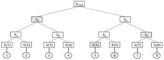 Merkle Tree: A Merkle tree [28] is a type of authenticated data structure for data verification. Figure 1 shows an example of a Merkle tree. Each leaf node holds a digest of stored data, and each non-leaf node represents the tree structure for storing data. First, the hash value of the stored data is calculated when constructing a Merkle tree, which denotes the hash value of the leaf node. Each non-leaf node derives a hash value from its children. For example, in Figure 1, the hash value of non-leaf node is calculated by , where the symbol ‘’ denotes concatenation. The hash value of the root node, which is called the root hash, is stored and published for data consistency checks. The Merkle tree calculates the current hash value of the root node layer by layer and then compares it with the root hash to check the consistency of the stored data. When the two hash value match, the consistency check passes. Otherwise, it fails. Thus, the Merkle tree can verify the stored data in logarithmic complexity. For example, to verify the existence of data whose value is 6, the verification proof of the Merkle tree consists of (shaded in Figure 1). The verifier reconstructs the root hash using the verification proof and the data value and compares it to the public Merkle tree root hash. The existence of data is verified if the two root hash value match. Compared to other storage structures, tree storage structures have lower verification complexity and are more conducive to the construction of our scheme. Section 4.1 provides specific instructions for using Merkle trees.