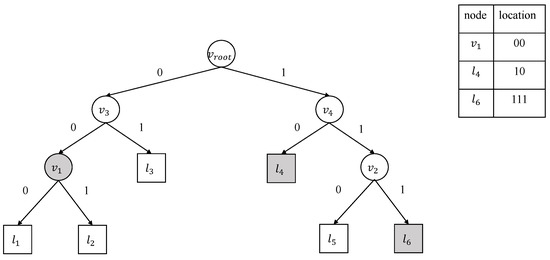 Figure 4 denotes the query of location information. For example, the location information of node , , and (shaded in Figure 4) is the bit string 00, 10, and 111, respectively. After that, CS constructs the ADS structure for all the subtrees and updates the hash value using the hash function H. Meanwhile, CS records the update operation of each subtree insertion or deletion using the bit string b, with insertion being 1 and deletion being 0. Algorithm 5 generates the updated proof. The algorithm takes the updated decision tree model and the subtree information as input and constructs updated proofs for each subtree. Since there are m subtrees, the final updated proof is . The updated proof consists of the location information , the updated proof for subtrees, the hash value of the root of the decision tree, and the bit string b.