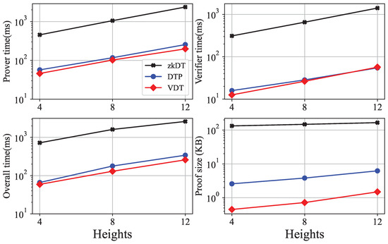We evaluated the performance of the VDT scheme according to the system workflow. The following metrics are measured and reported: (1) the model initialization time ; (2) the proof construction time and the overall proof size s; and (3) the result verification time . Among all the parameters, remains unchanged when inputting different data samples. For decision trees and , the model initialization time is 3.21 ms and 16.44 ms, respectively. As we can see, although the model initialization time of VDT increases rapidly with the growth of nodes and height, the initialization time is only in the order of milliseconds. This is because the preprocessing in our VDT only involves computing hashes and tree construction, which is very fast in practice. Specifically, since we focus on binary decision trees with the height h, the maximum number of hash calculations required to build ADS is .