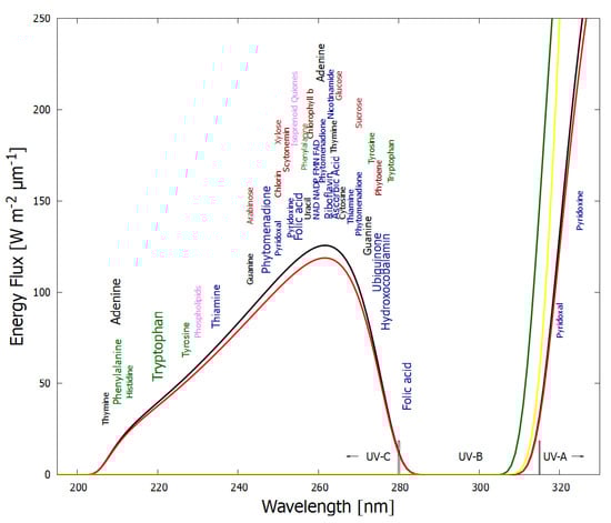 The spectrum of UV light available at Earth’s surface before the origin of life at approximately 3.9 Ga and until at least 2.9 Ga (curves black and red respectively), perhaps even extending throughout the entire Archean until 2.5 Ga []. Atmospheric CO2 and probably some H2S were responsible for absorption at wavelengths shorter than ∼205 nm, and atmospheric gas aldehydes (e.g., formaldehyde and acetaldehyde, common photochemical products of CO2 and water) absorbed between about 280 and 310 nm []), approximately corresponding to the UV-B region. By around 2.2 Ga (green curve), UV-C light at Earth’s surface was completely extinguished by the UV-C pigments oxygen and ozone resulting from organisms performing oxygenic photosynthesis. The yellow curve corresponds to the present surface spectrum. Energy fluxes are for the sun at the zenith. The fundamental molecules of life, suggested to have been dissipatively structured under this light as UV-C pigments, are plotted at their wavelengths of maximum absorption; nucleic acids (black), amino acids (green), fatty acids (violet), sugars (brown), vitamins, co-enzymes and cofactors (blue), and pigments (red) (the font size is roughly proportional to the relative size of the respective molar extinction coefficient). Adapted with permission from Ref. [].