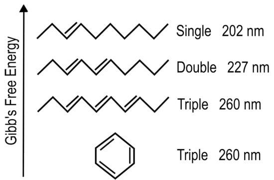 The absorption of UV-vis light in organic molecules is a phenomenon involving collective electron excitation requiring conjugation of carbon bonds (alternation of double and single carbon-carbon covalent bonds—Figure 3). Conjugation, implies removing hydrogen ions from saturated hydrocarbons to form carbon-carbon double bonds (C = C) thereby freeing electrons from their atomic orbitals. This provides a new set of collective electronic excited states involving a number of atomic nuclei now sharing their valence electrons. Atomic electronic orbitals thus become molecular orbitals which can be either bonding or anti-bonding between atoms. The greater the conjugation number, the greater the wavelength of peak absorption of the molecule (Figure 3). The energy difference between the ground state and first excited state for doubly and triply conjugated carbon based molecules corresponds to the range of energies of the soft UV-C photon region arriving at Earth’s surface during the Archean (Figure 2).