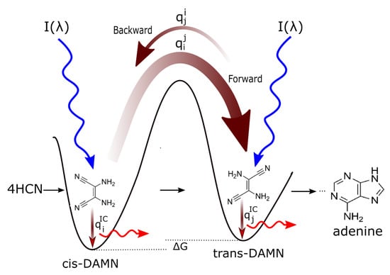 Mechanism for the evolution of molecular structures towards ever greater photon dissipative efficacy (microscopic dissipative structuring) on route to the fundamental molecules (in this case adenine, see Figure 5). The high activation barriers between configurations mean that reactions will not proceed spontaneously but only through coupling to photon absorption events. Forward and backward rates depend on photon intensities I at the different wavelengths of maximum absorption for the two structures, and on the phase-space widths of paths on their excited potential energy surface leading to the conical intersection giving rise to the particular transformation, implying different quantum efficiencies for the forward (q) and backward (q) reactions. Assuming that the intensity of the incident spectrum is constant, and since and (where the “⋯” represents quantum efficiencies for other possible molecular transformations), those stationary states (corresponding macroscopically to molecular concentration profiles) with greater photon dissipative efficacy (higher quantum efficiency for internal conversion q) will therefore gradually become more predominant under a continuously impressed UV-C photon flux, independently of the sign or size of the difference in the Gibb’s free energies ΔG of the molecules. This process, of selection of molecular concentration profiles of ever greater photon dissipative efficacy, driving evolution towards the right in the diagram, we call natural thermodynamic selection.