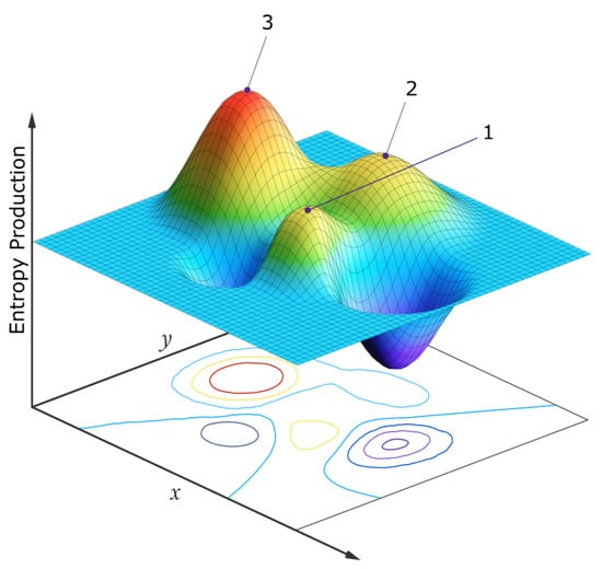 Alternatively, non-equilibrium thermodynamic theory in the non-linear regime, as developed by Onsager, Machlup, Prigogine, Nicolis, Glansdorff and others [,,], provides a physical/chemical description of the complex dynamics of material interacting with its environment. Under this framework, processes, known as dissipative structures (flows) [,] arise “spontaneously” under an imposed external thermodynamic potential (force) to dissipate this potential. Under given external conditions (external forces), multiple, locally stable stationary states exist for non-linear systems and this means that, under perturbation, the material system evolves over these states, directed by both stochastic fluctuations and deterministic thermodynamic law derived from the second law and the conservation laws (related to fundamental symmetries of nature).