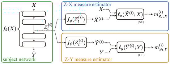 Proposed approach. We used two estimator neural networks and to study the behavior of the Z-X measure and the Z-Y measure associated with the different representations of the subject network . The and are squared loss and cross-entropy, respectively.
