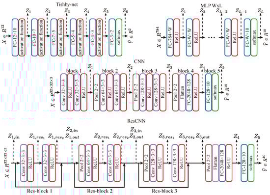 The architectures of subject neural networks involved in this paper. Tishby-net will be trained on the Tishby-dataset proposed in [], MLP W × L will be trained by MNIST dataset [], and CNN and ResCNN will be trained on CIFAR-10 dataset []. FC stands for fully connected layer, Conv represents the convolutional layer, and Pool refers to the max pooling layer. Note that we intentionally kept the architecture of the CNN as close to ResCNN as possible to enable a better-controlled comparison in later experiments.