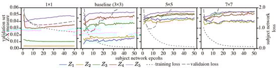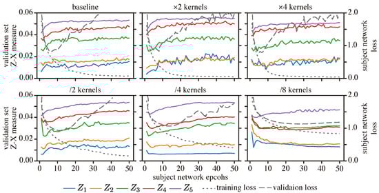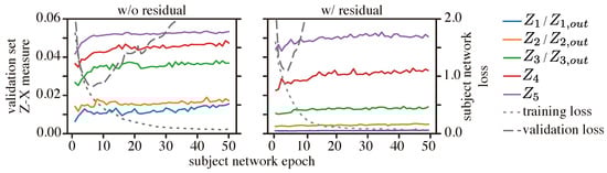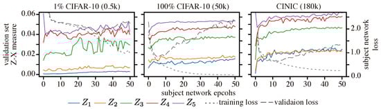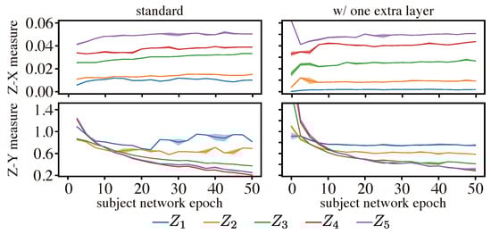 - To estimate the Z-Y measure for CNN and ResCNN, we flattened the representation into a vector and employed the same network architecture as for the Z-Y measure estimator of Tishby-net and MLP WxL models. In turn, to estimate the Z-X measure, we used a convolution layer with a 3 × 3 kernel size to map the representation into the input space of . However, if the representation is down-sampled by a pooling layer (e.g., Figure 2 CNN ), we up-sampled it using a transposed convolutional layer with a 2 × 2 kernel size before feeding it into the convolutional layer. The number of transposed convolutional layers equals the number of pooling layers that the representation has gone through since each transposed convolutional layer can only up-sample the representation by a factor of 2. ReLU non-linearity exists between all hidden layers. For example, when the representation is generated by a layer with two pooling layers before it (e.g., Figure 2 CNN ), the estimator for the Z-X measure would contain two transposed convolutional layers.