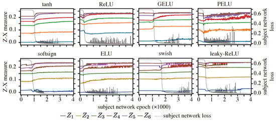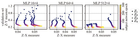This approach has led to the identification of some trends associated with the optimization of neural networks. In particular, by observing the IP-dynamic of the networks trained on a synthetic dataset and the MNIST dataset, ref. [] found that, in early epochs, both and increase; and, in later epochs, will keep increasing while decreases. This led to the conjecture that the training of a neural network contains two different phases: (1) a fitting phase, where the network representation Z fits the input data X as much as possible, and (2) a subsequent compression phase in which the network compresses the useless information in the representation Z about the labels Y.
