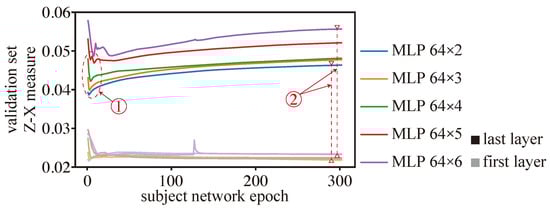 - For Tishby-net and MLP WxL models, the models for both the Z-X measure estimator and Z-Y measure estimator are fully connected neural networks. The input layer of the estimator networks matches the dimension of the representation (), while the output layer has a dimension equivalent to either the input vector (for Z-X measures) or label length (for Z-Y measures). If the estimator network has multiple layers, its hidden layers will be connected using ReLU non-linearity and have a number of neurons equal to the dimension of representation ().