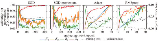 Subject Network Learning Algorithm: We also adopted a series of learning algorithms, including (1) training a CNN on the CIFAR-10 dataset using different optimizers, such as non-adaptive (SGD, SGD-momentum) and adaptive (RMSprop, Adam); (2) training an MLP on the MNIST dataset with or without weight decay regularization, where the regularization hyper-parameter was set to 0.001; and (3) training a CNN on the CIFAR-10 dataset with or without dropout regularization, where the dropout was only applied on the fully connected layer of the CNN as implemented in []. These setups allowed us to study the effect of different optimization algorithms and regularization methods on network dynamics.