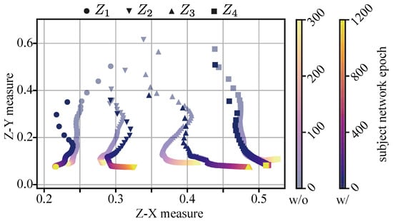 Plane and Dynamics of the Z-X and Z-Y Measures: Equipped with the measures in Equations (4) and (6), one can immediately construct a two-dimensional plane plotting the Z-X measure against the Z-Y measure as a function of the number of network training epochs in order to understand (empirically) how a particular neural network operates. Such a plane and the associated dynamics are the analogue of the IB plane and the IB dynamics introduced in [].