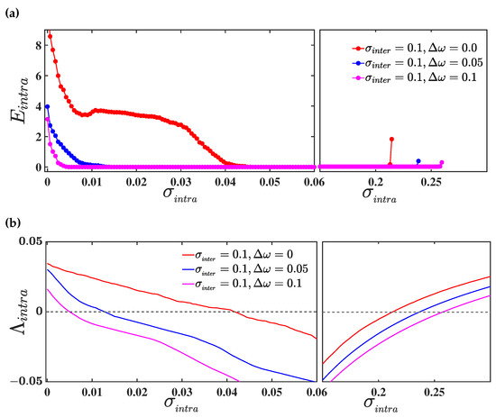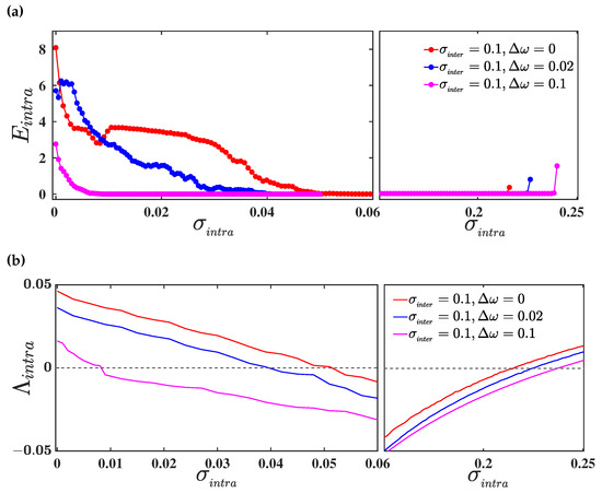 Proceeding, we evaluate the intralayer synchronization error as a function of for different values of mismatch parameter and a fixed value of the interlayer coupling strength . Figure 3a delineates the corresponding results, where red, blue, and magenta curves illustrate the intralayer synchronization transition for three different values of mismatch parameter , , and , respectively. Here, we observe that the intralayer synchronization occurs in a bounded interval , where indicates the critical intralayer coupling for the transition from desynchrony to synchrony (synchrony to desynchrony). For , i.e., when both the layers are identical, the intralayer synchronization error becomes 0 within the range of interval . In the presence of parameter mismatch , the intralayer synchronization occurs for a comparably larger interval of intralayer coupling strength . For larger values of parameter mismatch , intralayer synchrony emerges even in a wider range of coupling strength . Therefore, intralayer synchrony on multiplex networks can emerge more easily, due to the introduction of parameter mismatch among the layers, than on a multiplex network with identical layers. In other words, due to the parameter mismatch in one layer, the other layer can achieve synchrony at those values of intralayer coupling strengths at which synchronization is not possible with identical parameter values. Hence, we can conclude that parameter mismatch in one layer induces synchronization in another one.
