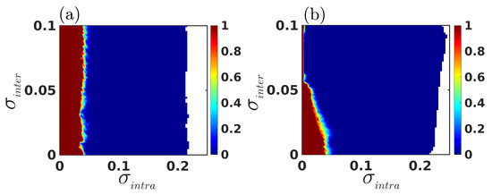 Thereafter, to scrutinize the complete scenario of intralayer synchronization in a wider range of parameter values, we evaluate by simultaneously varying the intralayer and interlayer couplings, and , respectively, for two different values of mismatch parameter . The corresponding result is illustrated in Figure 4, where the color bars indicate the variation of , with the deep blue region representing the domain of synchronization. In the absence of mismatch , i.e., when both the layers are identical, intralayer synchronization emerges within a bounded region of coupling strength, where the left and right bound of the interval indicates the critical intralayer coupling strengths for the transition from desynchrony to synchrony and from synchrony to desynchrony, respectively. Furthermore, these left and right critical points for the emergence of synchrony are almost identical, independent of the value of , i.e., the occurrence of intralayer synchrony for identical layers is almost independent of the interlayer connections (see Figure 4a). On the other hand, in Figure 4b, when a mismatch is introduced (i.e., ), the area of synchrony increases along with the increasing value of interlayer coupling . Here, the critical coupling for the transition from desynchrony to synchrony decreases with increasing values of , up to . Beyond that, the critical coupling for the achievement of intralayer synchronization is almost identical, independent of the value of . In addition, the critical coupling for the transition from synchrony to desynchrony increases with increasing . Therefore, due to the introduction of a mismatch between the layers, the multiplex network can achieve intralayer synchrony for those pairs of , where the intralayer synchronization is forbidden for multiplex network with identical layers, or, in other words, mismatch introduced in one layer induces synchronization in another, because of the simultaneous occurrence of layer-wise synchrony. This eventually results in an enhancement of the area of intralayer synchronization.