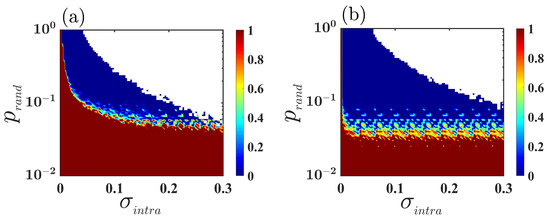 Until now, the results we have discussed have been for multiplex networks with fixed intralayer connectivity structure, i.e., the value of edge-joining probability is fixed. But, is one of the most important parameters in our study, as it indicates how densely the nodes within the layers are connected to one other. Therefore, we now investigate the combined effect of mismatch and layer-wise connectivity density. In Figure 5, we evaluate the variation of the intralayer synchronization error, by simultaneously varying and for the identical parameter, i.e., (Figure 5a) and mismatch parameter with (Figure 5b), while keeping the interlayer coupling strength fixed at . As observed, the region of synchronization enhances in the presence of the mismatch parameter, compared to the scenario where no mismatch among the layers is considered: in other words, due to the introduction of mismatch among the layers, intralayer synchronization emerges for those connectivity probabilities at which the multiplex network with identical layers is unable to achieve synchrony.