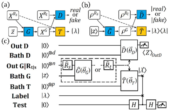 Next, we discuss the state evolution of the above scheme on a circuit and demonstrate how an equilibrium point of the game was reached. The quantum circuit of Figure 1b is displayed in Figure 1c. The whole circuit ran on seven quantum registers. The register Out G|Rt|s containing n qubits encoded the target data, source data, or the generated data. The encoding of the target (source) data was described by the operator (), which acted on the register Out G|Rt|s. The register Bath G, containing m qubits, encoded the quantum noise state . The generator operated on Out G|Rt|s and Bath G, producing the generated data. The register Bath D, containing d qubits, was employed as the internal workspace of the discriminator , whose outputs ( or ) were stored by the register Out D. The register Bath T contained p qubits and was employed as the workspace of the classifier . The label state outputted by was compared with the single qubit label state stored by the register Label. The register Test was used to perform the estimation of the likelihood of and , so that could be properly labeled. All qubits were initialized to be , except for those in Bath G and Label. The initial state of the quantum circuit shown in Figure 1c could then be denoted by
