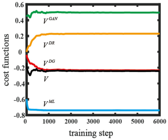 In this scenario, we trained the gradient steps for this scheme according to the updated rules of Equation (17). At the beginning of the training sequence, the parameters were randomly chosen. Similarly, we adopted RMSProp [68] to update the learning rate. The idea of RMSProp is to divide the learning rate of a weight by a running average of the magnitudes of recent gradients for that weight. With the help of RMSProp, the learning rate is largely updated in flat directions and finely tuned in steep directions. This speeds up the training process; it has shown a good adaptation of learning rates in different applications. Here, the initial learning rates of , , and were set to 0.001, 0.001, and 0.005, respectively. The training progress terminated; after that, the cost function converged at an equilibrium point. The numerical simulation results are shown in Figure 2.