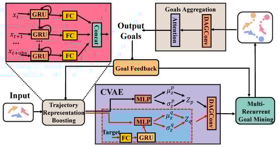 Recent research has focused on generating multiple possible future trajectories because the future motion of objects is uncertain, and this approach may provide more realistic predictions and improve the safety of autonomous systems. For instance, a car may turn left or go straight at an intersection, leading to different future trajectories depending on the driver’s intended destination. Similarly, a person may produce multiple possible future trajectories depending on their intended destination. At present, multi-modal trajectory prediction is mainly based on generation methods, which can be divided into two categories: GAN generation methods [,,] and conditional variational auto-encoder (CVAE) methods [,,,,,,].