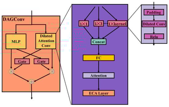 The structure of DAGConv (dilated attention gating convolution) is shown in Figure 2, which is mainly composed of DAConv (dilated attention convolution), MLP (multilayer perceptron), and a gating mechanism. DAConv and MLP separately mine the information and then each pass the gating, and, finally, the two results are added to obtain the final output. The following introduces the structure of DAConv: