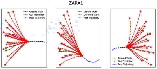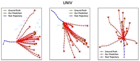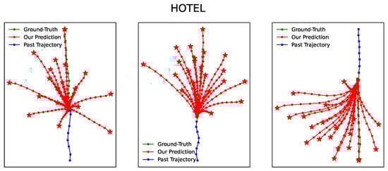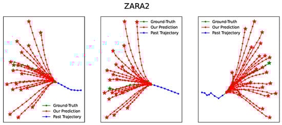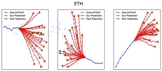 To account for the uncertainty in an object’s future trajectory, this paper employs multiple trajectory prediction to simulate the diversity of potential outcomes. Following previous research, K is set to 20 samples, which equates to predicting the future 20 trajectories of the object. Notably, the choice of K can significantly affect the prediction results. To demonstrate this effect on the proposed model’s predictive performance, we conducted further experiments using different K values and prediction lengths ( and ) and performed a comparative analysis. The results are presented in Table 3 and Table 4. Interestingly, as K increases, the two metrics’ values of the experimental results for all five datasets decrease. This suggests that the proposed model’s predictive performance improves as K increases.