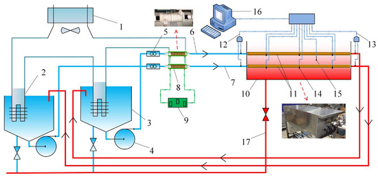 Schematic of the experimental rig. 1—Water chiller; 2—Cooling apparatus; 3—Experimental fluid tank; 4—Variable-frequency pump; 5—Ultrasonic flowmeter; 6—Circulation loop of side A; 7—Circulation loop of side B; 8—AEFTD; 9—Electromagnetic signal generator; 10—Thermostatic bath; 11—Shell-and-tube heat exchanger; 12—Inlet temperature; 13—Outlet temperature; 14—Wall temperature; 15—Bath temperature; 16—Data-acquisition system; 17—Drainage system.