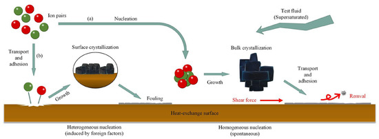 Although supersaturation is a necessary condition for the formation of crystallization fouling, it is not a sufficient condition. In fact, crystal growth requires a decrease in Gibbs free energy as the crystal size increases. If the crystal is smaller than its critical size, its Gibbs free energy will increase with increasing crystal size, and the crystal will tend to be redissolved in solution. Therefore, the solid boundary, such as the heat exchange surface, or suspended particles, like embryos, often serve as crystallization sites. As a result, there are two ways of forming crystallization fouling. The first way is that the ions, such as Ca2+ and CO32−, form crystal nuclei in a solution and then grow into crystals (bulk crystallization). These crystal particles are then transported and attached to the heat exchange surface, which is called homogeneous precipitation, as shown in Figure 3a. The second way is that the ions are directly transported to the nearby heat exchange surface by the fluid. They make contact with the heat exchange surface and nucleate and grow into crystals, thus forming crystallization fouling (surface crystallization). This process is called heterogeneous precipitation, as shown in Figure 3b. During the process of heat transfer, both homogeneous and heterogeneous precipitation occur simultaneously. Therefore, the main factor affecting crystallization fouling is solution supersaturation. The higher the solution supersaturation, the stronger the driving force of crystallization. The heat exchanger surface is more likely to form crystallization fouling.