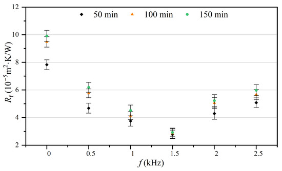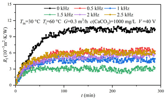 Figure 5 shows six fouling resistance curves under different electromagnetic frequencies, while Table 1 and Table 2 present the specific experimental conditions. As the experimental fluid flowed through the heat exchange surface that was clean and without pollutants, the CaCO3 precipitated and gradually deposited on the tube side of the heat exchanger, thus resulting in fouling resistance. It can be observed from Figure 5 that, over the whole experimental period, the fouling resistance curves showed the same trend, rising first and then gradually stabilizing. Therefore, they can be divided into the rising stage and the stable stage. During the rising stage, the CaCO3 continually crystallized and adhered to the tube side [24]. The fouling resistance of the heat exchange surface rapidly increased, during which the deposition rate () was higher than the removal rate (). Thereafter, as was equivalent to , the fouling resistance reached the stable stage and ceased to increase. The fouling resistance curves show obvious differences under different electromagnetic frequencies. When compared to the control group, the fouling resistances with the AEFTD were greatly reduced, indicating that the application of the AEFTD could effectively inhibit CaCO3 fouling formation on the tube side of the heat exchanger. Xing [25] reached the same conclusion.