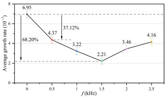 The fouling resistance of the heat exchange surface can characterize the accumulation state of CaCO3 fouling. Therefore, the growth rates of fouling resistance and CaCO3 fouling were considered equivalent. According to the above analysis, td in the control group (Figure 7) was taken as the deadline, and the average growth rates for CaCO3 fouling on the tube side of the heat exchanger under different electromagnetic frequencies were determined using Equation (18), as shown in Figure 8. The average growth rates showed a large difference with and without the AEFTD. When comparing the experimental results of the asymptotic value for the fouling resistances in Figure 6, both exhibit a similar trend with increasing electromagnetic frequency, indicating that the average growth rate was proportional to the asymptotic value of fouling resistance. In other words, the slower the growth rate, the smaller the fouling resistance asymptotic value. The average growth rate without the AEFTD was 6.95 × 10−7. After the application of the AEFTD, the average growth rates dropped by 37.12% to 68.20%, corresponding to different electromagnetic frequencies, indicating that CaCO3 fouling formation on the tube side was retarded. A minimum average growth rate of 2.21 × 10−7 was achieved at the electromagnetic frequency of 1.5 kHz. The reduced growth rate using the AEFTD is the desired result.