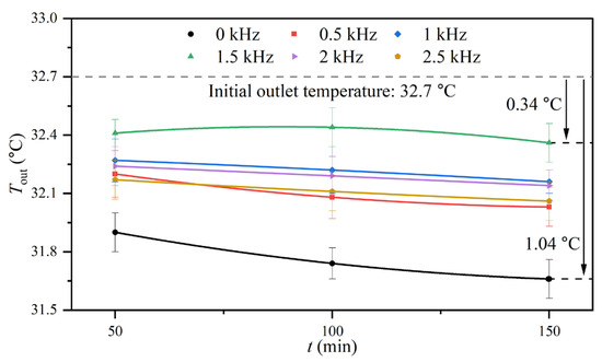 Therefore, by combining the conclusions from Figure 5, the experimental results of the control group and 1.5 kHz condition were taken as examples for analysis. The asymptotic value of fouling resistance in the control group was the maximum: 10.15 × 10−5 m2·K/W, indicating that fouling accumulation on the heat exchange surface was more serious and obviously hindered heat transfer and the asymptotic value for fouling resistance at 1.5 kHz was the minimum: 2.93 × 10−5 m2·K/W. Meanwhile, it can be seen from Figure 9 that the outlet temperatures of the experimental fluid corresponding to the former were the lowest at each moment, while the outlet temperatures corresponding to the latter were the highest. When the experiment was carried out for 150 min and was compared with the initial outlet temperature, the outlet temperature of the control group decreased by 1.04 °C, and the outlet temperature of the 1.5 kHz condition decreased by 0.34 °C, indicating that the application of the AEFTD at 1.5 kHz increased the outlet temperature by 0.7 °C. The above analysis results show that the trend change was the opposite between fouling resistance and the outlet temperature of the experimental fluid, which indicated that the application of the AEFTD enhanced heat transfer.