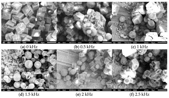 Crystallization fouling is affinitive to the nucleation and growth of crystals. Therefore, variation in crystal morphology is also important for investigating the influence of the AEFTD on the crystallization fouling of a heat exchange surface. The three main types of CaCO3 crystal morphologies are vaterite, aragonite, and calcite [26], which belong to hexagonal, trigonal, and orthorhombic systems, respectively. Regarding the stability of the crystals, vaterite, with a spherical structure, is the least stable, followed by metastable aragonite with an acicular structure, whereas calcite, with a rhombohedral structure, forms the most stable crystal morphology and is widely found in nature. Prior to commencing the experiment, a red copper plate with a thickness of 0.5 mm, length of 20 mm, and width of 20 mm was bent and placed close to the tube side of the heat exchanger. The fouling samples on the red copper plate were dried and analyzed using SEM during the experiment. SEM micrographs (×2000) under different electromagnetic frequencies are shown in Figure 10.