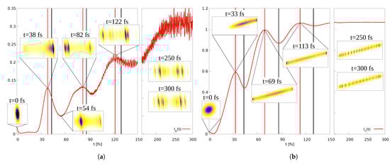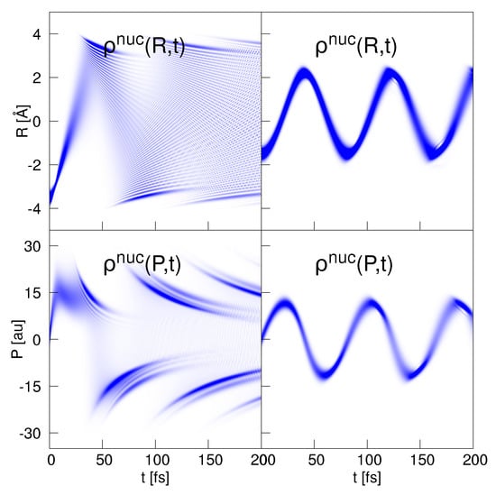 The nuclear dynamics is illustrated in Figure 2, left upper panel. It is seen that the probability density performs a vibrational motion, but at the end of the displayed time interval, dispersion causes the density to be distributed over the entire classically allowed region. The corresponding momentum density is shown below the coordinate density. It reveals a complex structure which includes, as is also seen in the coordinate-space density, interference fringes. The latter arise when reverses its direction of motion so that changes from a positive to a negative momentum distribution. It is obvious that the ansatz for the nuclear momentum density given in Equation (A15) cannot accurately describe the numerical result shown in the figure. This, in particular, applies to the seen fringes and also to the rapid change from positive to negative momenta. Nevertheless, the derived analytical entropies still prove to be valuable because they are quantities derived from an integration over all momenta.