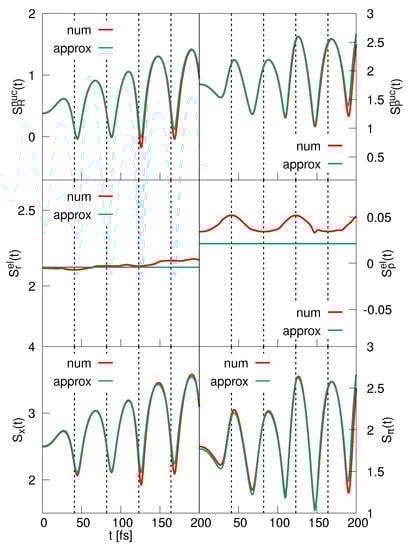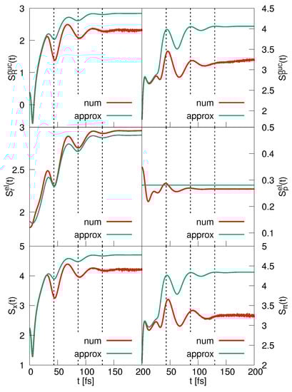 The comparison of Equations (31) and (33) shows that the nuclear and electronic coordinate entropies exhibit minima and maxima at the same times. This indeed is seen if these curves are compared (upper and middle left panel of Figure 3). The agreement between the numerically and analytically determined electronic entropies is astonishingly good. Not unsurprisingly, we find that at the turning points where the electron–nuclear wave packet reverses its motion, we know more precisely where the electron is located as is the case for the nucleus. This is also reflected in the total spatial entropy (lower left panel of the figure). The approximate function is, at all times, larger than the numerical one, which is a property of the normal probability distribution [].