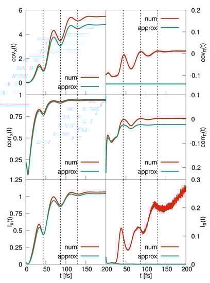 Let us, in what follows, discuss the three measures of particle entanglement, namely the covariance, correlation and mutual information as defined in Section 2.2. The covariance functions are shown in the upper left panel of Figure 4, and it is seen that the analytically derived curve again provides a very good approximation of the numerically exact one. Thus, using Equation (41) for interpretation, a localized nuclear density, corresponding to a large value of , goes in hand with a low degree of particle correlation. The reason is that in this case, the R-dependence of the electronic wave function entering into the BO wave function is of minor importance so that the wave function is approximately separable. This shows that at times when the classical turning points (which are indicated as dashed vertical lines in Figure 4) are reached, the covariance takes on minimal values. The same applies to the correlation (middle left panel of Figure 4) and also to the MI (lower left panel). All three functions exhibit a comparable time dependence so that we conclude that they measure the correlation in a very similar way.