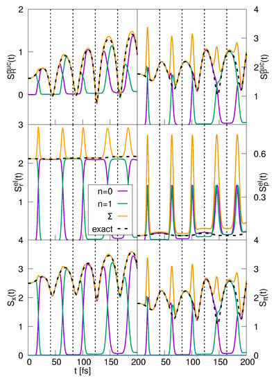 In the left-hand column of Figure 7, we show the results of the decomposition of the coordinate-space entropies. The nuclear functions for the quantum numbers are displayed in the upper left-hand panel of the figure. Also included is the sum of these two components and the numerically determined nuclear entropy . The components follow the population dynamics and also reflect the focusing and broadening of the wave packet components in the two states. The term contributes to the entropy until the non-adiabatic transition takes place. Then, this function decreases, which goes in hand with an increase in until the latter function becomes equal to the nuclear entropy. This behavior takes place several times in the shown interval, and, besides minor deviations, at all times, the sum of the two components equals the numerically determined nuclear entropy. To understand this, we write the latter within the approximation of two contributing states: