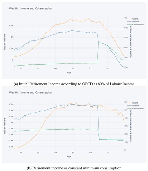 Retirement age and retirement income can be accounted for in the system. For the sake of simplicity, initial simulations neglect the retirement period, by only focusing contribution period, but the system is later extended to cover the retirement period. Retirement income is defined as a fraction of the last income; fractional retirement income is recommended by international institutions, and this methodology is often also used in the literature [10].