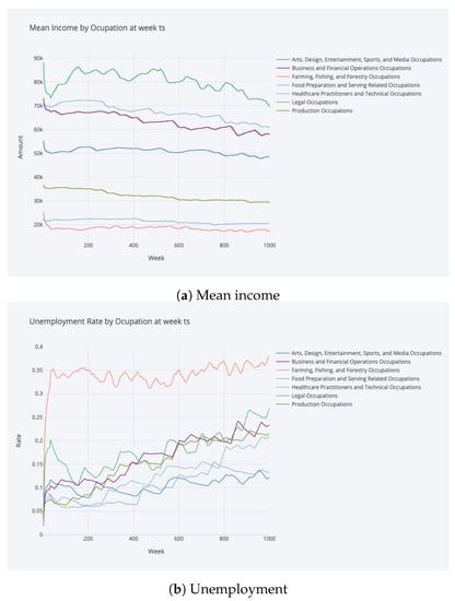 Mean Income and unemployment by occupation at week ts.