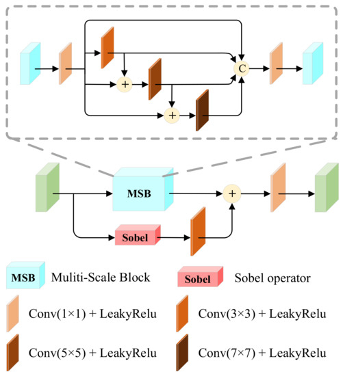 where denotes the convolution operation, denotes the cascade on the channel dimension, denotes the Sobel operator, and denotes element-wise summation.