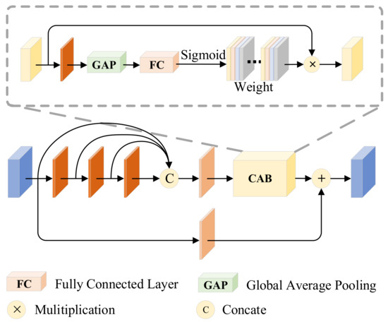 The specific structure is shown in Figure 3, which integrates dense connectivity [17], residual streams [35], and channel attention (CAB). To obtain comprehensive feature information, we introduce dense connectivity in the mainstream, but to address the high memory cost and energy consumption due to feature reuse, it is replaced by aggregating the features of all previous layers in the last layer of dense connectivity. Densely connected features are input to attention in order to make the network more focused on the attention region. It is remarkable that we generate salient target images in the training phase, while the infrared salient target features are input directly into the subsequent network in the inference phase.