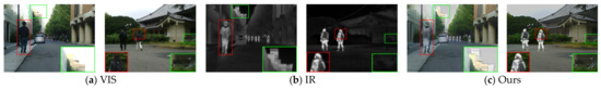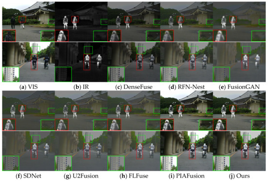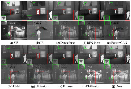 It is difficult to obtain high quality images during image acquisition due to weather, environment, etc. [1,2]. To improve image quality, researchers have proposed various image processing technology methods [3,4], and image fusion, as an image enhancement technique, can synthesize the complementary information between images to maximize the details of the imaged scene [5]. Among them, infrared and visible image fusion has become a hot research topic in the field of image processing due to its applications in the military and other fields [6]. Visible images usually contain a large number of texture details, but they are susceptible to environmental effects; in contrast, infrared images have the feature of highlighting thermal targets, but infrared images have problems such as a lack of background information, noise, and low resolution [7]. Therefore, the complementary characteristics of infrared and visible images enable their fusion to comprehensively describe the imaging scene, thus providing more feature information for subsequent advanced vision tasks such as pedestrian detection [8], image segmentation [9], etc.