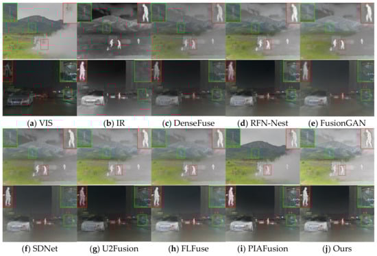 In the scenes where the visible image targets are obscured as shown in Figure 7, the method in this paper can mine the salient targets hidden in smoke because the method in this paper uses intermediate salient loss to guide the tributaries to enhance their strong contrast. Among the seven comparison algorithms, DenseFuse can retain texture information but ignores the salient contrast of the target, while background information is smoothed to different levels in RFN-Nest, FusionGAN, SDNet, U2Fusion, and FLFuse. In contrast, although PIAFusion can better preserve the high contrast of salient targets, it is easy to lose the IR modal information of obscured objects such as sky and smoke due to the smoothness of light perception loss.