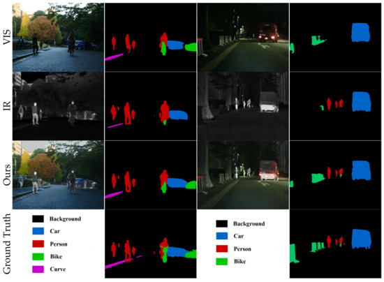 In the night scene, as shown in Figure 8, columns three and four, the visible image cannot capture enough information due to the lack of light, so the segmentation network has a low segmentation accuracy for people in the scene, as shown in Table 2, fifth row, fifth column. While the infrared image captures the thermal target so the segmentation accuracy for people is higher as shown in the fifth column of the sixth row of Table 2; however, the infrared image reduces the segmentation accuracy of the bicycle.