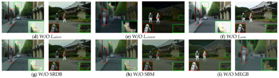 MEGB can fully extract the texture information of the image by using multiscale feature extraction with gradient operator embedding. As shown in Figure 9i, when we exclude the multiscale edge gradient block, the overall scene is relatively smoother with less gradient variation. Additionally, the values of AG and SF in Table 3 drop significantly, indicating that the module does enhance the representation of network texture details.