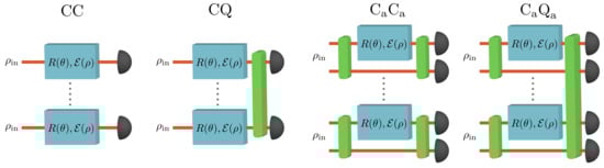 The physical process of quantum metrology can be described as a quantum channel with several different variations possible depending on the degree to which we wish to exploit quantum mechanical effects [90]. In this work, we consider four different schemes; Classical-Classical (CC), Classical-Quantum (CQ), Classical with ancilla-Classical with ancilla (), and Classical with ancilla-Quantum with ancilla (). These four schemes are distinguished by how the states are prepared, either using entangled states or non-entangled states, and by how they are measured at the output, as shown in Figure 1. Note that, on the state preparation side, we only consider either single-qubit or two-qubit states. This is distinct from previous studies that considered the case where entanglement is generated across all input states before the channel [91]. In our model, as the quantum states pass through the channel they experience a small rotation about all three axes by angles before experiencing some form of decoherence. The quantum states are then measured, either using collective measurements or individual measurements. Individual measurements here mean that the probe states are measured one by one, in contrast to the most general measurement type, a collective measurement, which involves measuring multiple probe states simultaneously in an entangling basis. The quantum measurement strategies in Figure 1, thus refer to performing a collective measurement on asymptotically many copies of the probe state. However, we can also consider performing a collective measurement on a finite number of copies of the probe state. It is known that collective measurements offer no advantage over individual measurements (i.e., the CC and CQ strategies are equivalent, as are and ) for estimating only a single parameter or for estimating multiple parameters with pure states [92]. However, for the most general metrology problem, multiparameter estimation with impure probe states, quantum resources can offer an advantage at both the state preparation and state measurement stages. The advantage of quantum resources at either of these stages can be thought of as quantum-enhanced metrology.