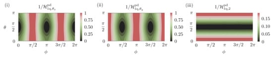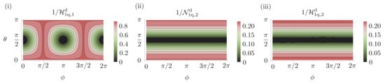 With a single-qubit, the optimal probe for sensing a rotation about the x-axis is any pure state in the Y-Z plane of the Bloch sphere. This is easily verified since, for estimating a single parameter, the Holevo bound coincides with the SLD bound, as in Equation (7). For the probe and a particular choice of the decoherence parameter, , we show the Holevo bound as a function of the Bloch sphere angles, and , in Figure 3i. This figure verifies our claim that any probe in the Y-Z plane () is optimal. The computation of the SLD bound is described in Appendix A. We now consider the state , one of the many possible optimal states. After the decoherence channel, this probe is left in the state