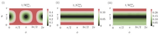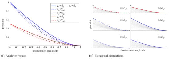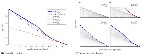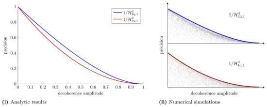 Parameter estimation in a decoherence channel with single-qubit probes on the Bloch sphere, . (i) Optimal achievable precision for estimating a single parameter obtained using the SLD bound, Equation (A4). The optimal probes lie in the Y–Z plane of the Bloch sphere. (ii,iii) The optimal achievable precision for estimating two parameters simultaneously when using individual and collective measurements, respectively, was obtained using the semidefinite programs put forward in Refs. [106,118]. These plots show that the state , which is one of many optimal states for estimating a single parameter, remains optimal for estimating two parameters. Contours are shown for .