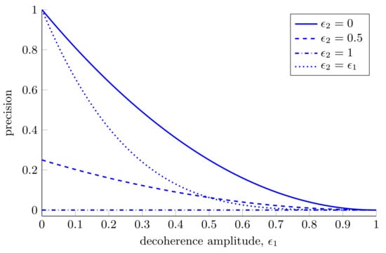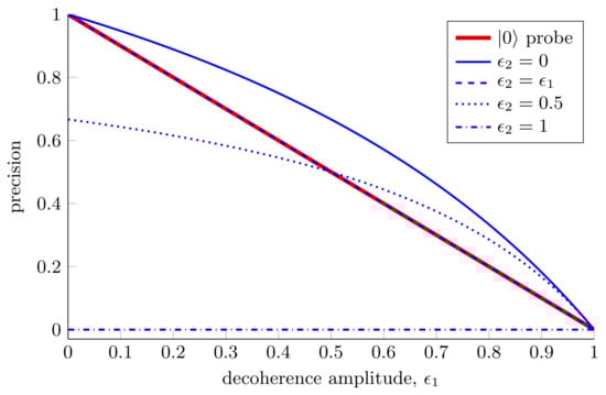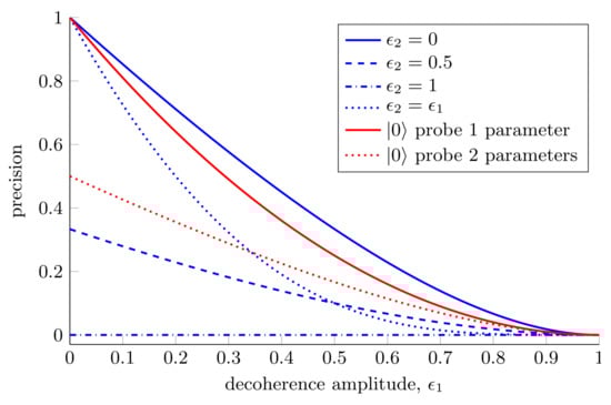 Although we have shown the advantages offered by two-qubit probes over single-qubit probes, this expression highlights the dangers associated with using highly entangled probes for estimation. Equation (43) is symmetric in and , which is somewhat surprising given that the rotation we are trying to estimate acts on the first qubit only. In spite of this, the decoherence of the second qubit is equally damaging to our estimation ability. We see that when the second qubit is fully decohered we are unable to estimate with any precision at all, regardless of the decoherence of the first qubit. This is shown in Figure 6.