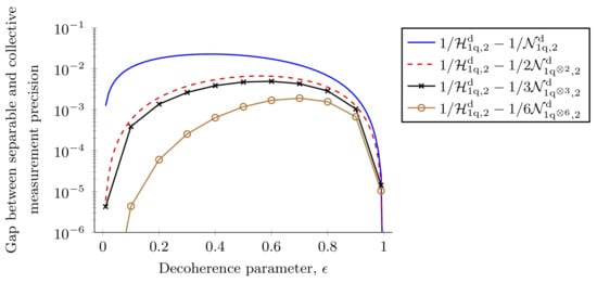 This is once again equal to the single-parameter result in Equation (30). Hence, we find that with a two-qubit probe, we can estimate all three parameters simultaneously just as well as we can estimate just one parameter. The ability of entangled probe states to avoid trade-offs in multiparameter estimation was observed before [35,55,56]. However, when restricted to individual measurements, the NHB is given by