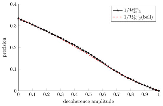 Perhaps the most physically relevant scenario is the one in which both qubits experience the same decoherence, i.e., . In this situation for estimating a single parameter the single-qubit probe described in Section 3.1.1 always outperforms the two-qubit probe considered. For estimating two parameters with the two-qubit probe the Holevo bound, Equation (43), remains unchanged. Even though, when using the maximally entangled two-qubit probe, we can estimate a second parameter for free, when the noise in the system is sufficiently high the single-qubit probe can still outperform the two-qubit probe for estimating two parameters. Thus, we can see that the optimal probe to use in this instance depends on the decoherence amplitudes experienced by both qubits. It is worth noting that in this high noise regime, a different two-qubit probe will be optimal and the optimized two-qubit probe will always perform better than or equal to the optimized single-qubit probe. The fact that the maximally entangled two-qubit probe is no longer optimal is a reflection of the fact that highly entangled states are very susceptible to loss and noise, see Refs. [6,143].
