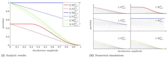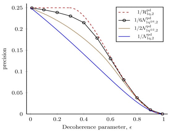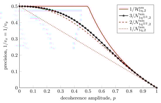 where the operators, , obey the completeness relation, . In what follows, we shall drop the explicit dependence of the quantum channel on . The operators are known as operational elements of the channel, or Kraus operators [132]. Note that, as is evident from Equation (16), the overall quantum channel we consider involves rotating the quantum state before subjecting it to the noise. K is known as the Kraus number and satisfies , where d is the dimensions of the system in question. For the map to represent a deterministic, physical channel, it must be linear, trace-preserving, and completely positive [133]. A deterministic channel here means that we do not allow postselection on certain measurement results. Quantum channels such as this are also called ‘trace-preserving completely positive’ maps. There are two distinct scenarios when considering estimation in the presence of noise. One is to perform the estimation using noisy probe states, , i.e., the decoherence happens before the rotations. The other is to use pure probe states, where the decoherence occurs after the rotation. In this work, we consider the second option. In all cases, we assume that the noise parameter is known, i.e., we do not need to treat it as a nuisance parameter as has been considered before [134,135].