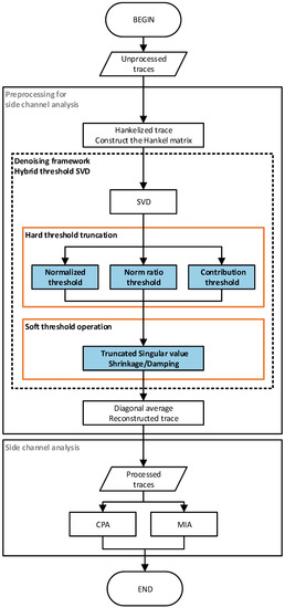 - Two kinds of non-profiled analysis experiments are carried out, which are Correlation Power Analysis (CPA) and Mutual Information Analysis (MIA). In Figure 1, the flow chart of the side-channel analysis based on the hybrid threshold denoising framework using singular value decomposition is given. In this paper, indicators such as signal-to-noise ratio (SNR) and success rate (SR) are used to evaluate the experimental results. The experimental results of CPA and MIA express the effectiveness of the proposed hybrid threshold denoising framework in side-channel analysis preprocessing.